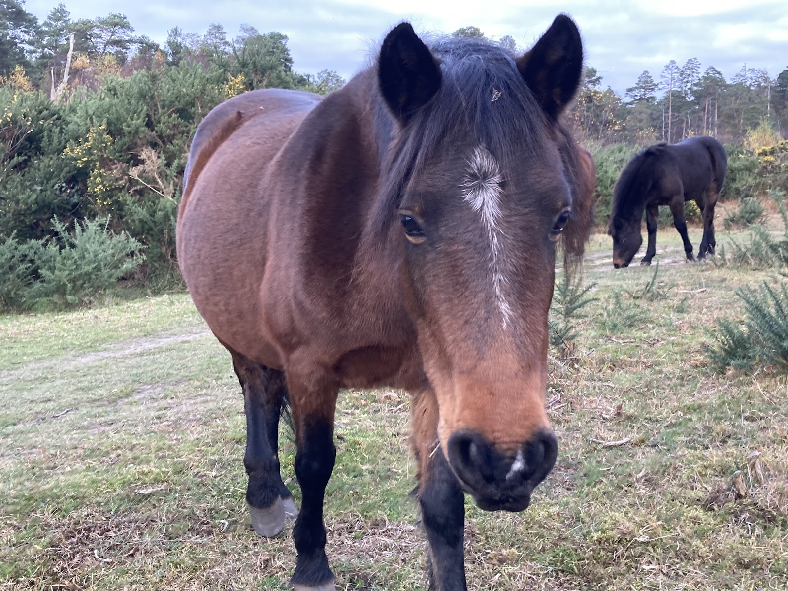 At 14:20 this afternoon, three ponies and the foal were resting near the northeast corner of Brock's Hill, while the others grazed in the nearby gorse bushes. Tilly was the first to greet me, offering gentle nuzzles and eagerly leaning in for a neck rub. Once we finished, the rest of the ponies came over one by one to say hello and enjoy their first strokes. Poppy was the last to emerge, clearly enjoying her time munching on gorse.